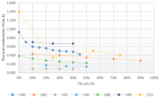 Thermal conductivity values for mortars with fly ash found in different studies.