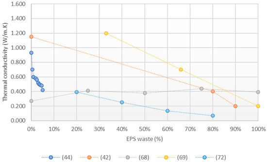 Thermal conductivity values for mortars with EPS waste found in different studies.