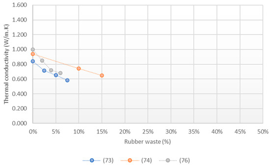 Some studies analysed the incorporation of rubber residues in thermal mortars to replace sand or as an additive, improving their thermal properties [73,74,75,76,77]. According to Kazmierczak et al. [76], the addition of crumb rubber leads to a reduction in thermal conductivity of up to 32% for a mortar with 6% of crumb rubber instead of river sand. As an additive for mortars, rubber particles were studied by Meshgin et al. [77]. The thermal conductivity measurements show that adding rubber particles both at a smaller and higher percentage resulted in lower thermal conductivity. According to the authors, the thermal conductivity of mortar depends not only on the volume fraction of the rubber particles but also on their average size.