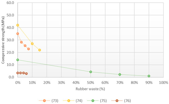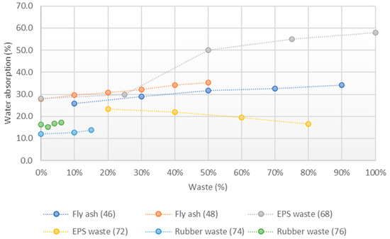 The values of the water absorption found for mortars with the most studied wastes, namely fly ash, EPS and rubber waste, are presented in Figure 9, and displayed values between 12% and 58.0%. For mortars with fly ash and rubber waste, there is a tendency for the water absorption to increase as the amount of incorporated waste increases. On the other hand, an increase in the percentage of EPS waste in the mortar can result in an increment [68] or reduction [72] in the water absorption values, which points to a great difficulty in comparing the values found in the literature.