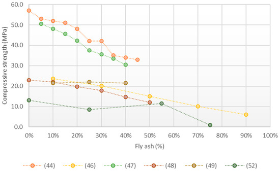 In another study by the same authors [48], fly ash was added to mortars to replace cement. When the fly ash percentage increased from 0% to 50%, the porosity of the samples increased by 18.91–28.62%. The authors highlighted that 1.5% resin added to the mixtures also had a great influence on the results. The study’s findings show that 30% of fly ash in mortars enable their use in surfaces in contact with water without the risk of cracking, splitting or dispersing. Furthermore, the 40% and 50% fly ash additives should not be used in contact with water due to the increase of 30% in water absorption rates of the mortars.