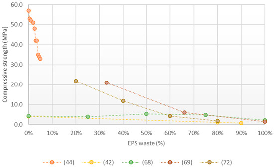 Tittarelli et al. [69] conducted a comparison between mortars incorporating virgin EPS and EPS waste at the same volume content. Recycled EPS mortars proved to have lower thermal resistance than those manufactured with a virgin material, but this can be counteracted by increasing the percentage of EPS. The authors highlight that an economical saving of over 25% can be achieved using recycled EPS to obtain mortars with a specific thermal insulating capacity.