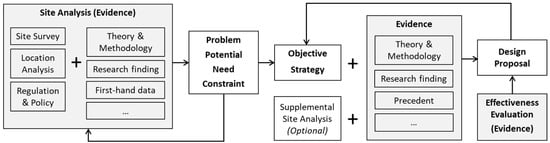 The premises of the proposal are mainly derived from the phase of site analysis in our urban design studio, which primarily aims to establish appropriate objectives and strategies for the project. Unlike typical EBD applications for healthcare facility design projects, which usually have clear and specific objectives from the onset, such as specific healthcare experience or outcomes, urban design is complex, and objectives defined from different perspectives would all be valid. Therefore, site analysis (see Figure 2) is pivotal for urban design to establish specific objectives to be attained and examined. For renewal projects, it is similar to the phase of “conduct post-occupancy evaluation” shown in Figure 1.