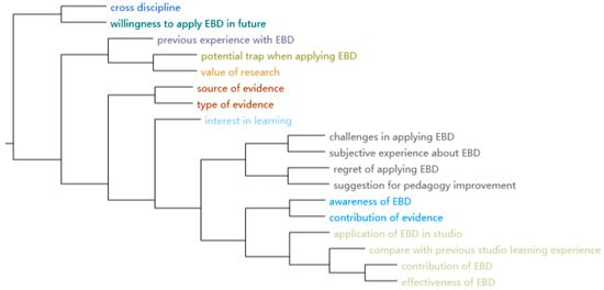 A total number of 18 nodes were coded based on EBD-related content in students’ module reflections. The nodes were clustered according to word similarity using Jaccard’s coefficient in NVivo, as shown in Figure 5. However, it is important to double-check the meanings of references under each node as the clustering was solely based on word similarity. As a result, a revised three-level node cluster emerged, which is presented in Table 3.
