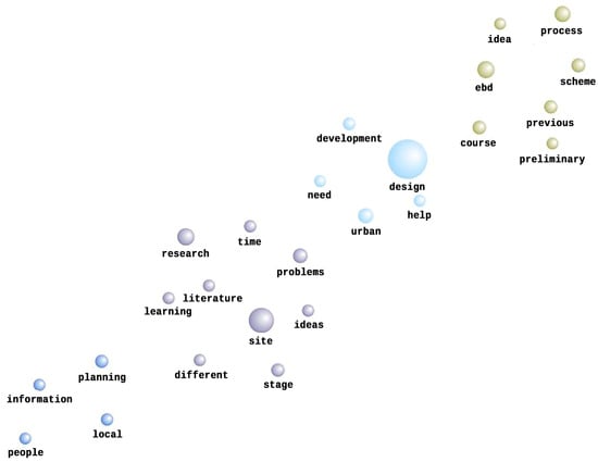 A word frequency analysis was performed on the 25 most frequently used words in all EBD-related student module reflections from both cohorts. The analysis only included words that had a minimum length of three letters and that matched exactly, using NVivo. The term “EBD” was mentioned 30 times, ranking third in frequency. A 3D cluster map was generated to display the four clusters for these top twenty-five words, as depicted in Figure 6. The diagram clusters words that co-occur and sizes the bubbles based on word frequency. The three most frequent words in the text are design, site, and EBD. Each of them forms a cluster of frequent words, indicating a close relationship within each cluster.