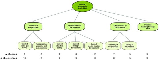 It was found that guests were primarily concerned with the premises, development, and effectiveness of the proposals. These findings suggest areas of focus for professional education with incorporating the EBD approach. To identify specific aspects that could be supported by EBD techniques during professional practice, the comments and suggestions provided by all guests during final presentations were further coded in NVivo. The coding process was primarily deductive, except for the emergence of a fourth theme, “optimize learning through EBD”. The coding results are presented in Figure 7.