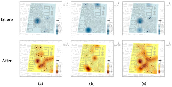 In 2023, a group utilized space syntax theory [,] (pp. 223–241) and the software Depthmap 10 in order to conduct computer simulations. They aimed to compare different design scenarios and demonstrate the effects of spatial connectivity before and after road system modification. The results showed that their final proposal improved the integration of the road system and increased the mean value by 9.1% (Table 5), which greatly improved the accessibility of the neighborhood []. In 2022, a group utilized ArcGIS spatial analysis to assess the effectiveness of their proposal in improving the public space system (Figure 8). Significant improvements were achieved by reopening buildings and courtyards that were previously owned by provincial or county guilds to the public, as well as creating public open spaces by demolishing illegal buildings. Besides Depthmap and ArcGIS, students also used Rhino and Ladybug to analyze microclimates and inform design decisions. Simulations quantified and visualized the effects of design proposals, making the decision-making process more scientific and convincing. As S-22-5 stated, “In the final presentation, I felt that my design had stronger support, rather than being a complete fantasy”.