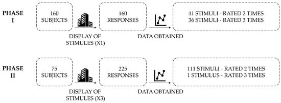 Sample. The sample consisted of 235 staff from the Universidad Politécnica of Valencia (50.64% female, mean age 35.83 years; σ = 2.31) selected through simple random sampling. Staff from the Architecture and Town Planning departments were excluded to ensure that any biased perceptions that construction and architecture experts might hold would influence the results. In phase I, 160 subjects participated (mean age 32.14 years; σ = 2.15), each of whom viewed and rated only one stimulus (thus, no stimulus was rated less than twice). Phase II involved 75 subjects (mean age 39.5 years; σ = 2.47). In this case, each subject viewed and rated 3 stimuli, providing a total of 225 responses. In each questionnaire, only one stimulus was assessed. These stimuli were presented and rated independently and consecutively (Figure 2).