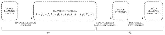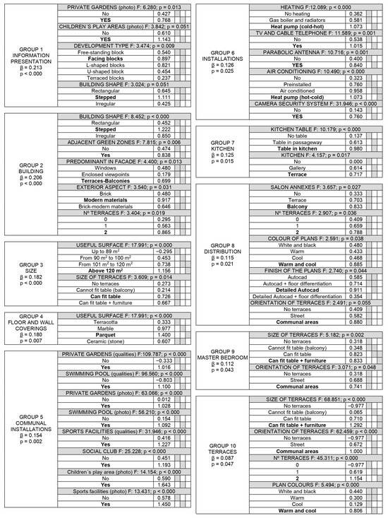 - (b) Identification of the design categories that influence perceptions of ‘Prestige’ in a real estate promotion. The Univariate General Linear Model procedure was used, taking each group as a dependent variable and each design element as independent variables. For design elements with more than two categories, the Bonferroni post hoc test was applied. This technique explains the different categories of each design element that create a significant difference in perceptions and the direction of the differences identified.