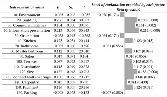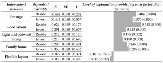 The R coefficient of the linear regression model for the dependent variable, the purchase of a home for investment, is 0.563. The model is shown in the graph on the left of Figure 5. It can be observed that the statistically significant factors (p < 0.05) are the same four as for the residence choice model. The difference lies in the order of importance attributed to the factors, with the ‘Prestige’ of the promotion being the most influential factor in the choice of a home for investment. Next is “Family home”, “Good layout”, and “Light and outward facing”.