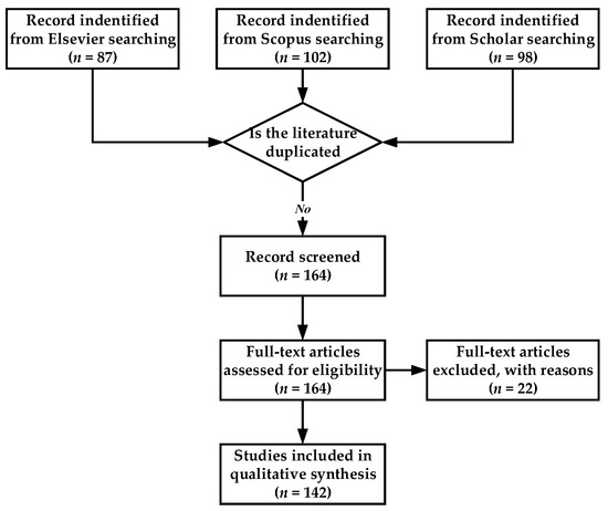 This research undertook a systematic review in accordance with the PRISMA framework. The primary literature sources for this study were primarily drawn from Elsevier, Scopus, and Google Scholar, chosen for their robust search capabilities, comprehensive coverage, and high academic authority. The principal keywords utilized in this search encompass “bridge structures”, “structural health monitoring (SHM)”, “wireless sensor networks”, while secondary keywords include “sensor technology”, “data technology”, and “wireless sensor deployment”. The search formula employed for Elsevier comprised the criteria: title, abstract, or author-specified keywords = “bridge structures” and (“structural health monitoring” or “SHM”) and (“wireless sensor network” or “wireless sensor deployment”) and (“sensing technology” or “data technology”). Similar search criteria were adapted for Scopus and Google Scholar with necessary syntactic adjustments. The Boolean operator “OR” was employed to broaden the search scope, facilitating the retrieval of a diverse array of relevant literature, while the “AND” operator was utilized to refine relevance, ensuring the inclusion of pertinent literature. Given the relatively nascent nature of wireless sensor networks applied to bridge structure health monitoring, the majority of retrieved literature spans the last decade (2014–2024). Eighty-seven, one hundred-two, and ninety-eight documents were retrieved from Else-vier, Scopus, and Google Scholar, respectively. The number of records retained for screening, following the elimination of duplicates, amounted to 164 journal articles. Subsequently, after screening titles and abstracts, 142 records were selected for full-text review, as depicted in Figure 2.
