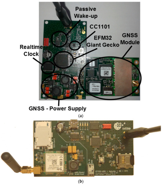 Photo of the GNSS sensor node and the GSM base station node [7]. (a) Photo of the GNSS sensor node (b) Photo of the GSM (global system for mobile communications) base station node.