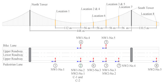 Due to the lack of specific regulations or guidelines requiring the precise placement of sensors on different types of bridges, scholars utilize various factors, such as engineering standards, project specifications, and personal experience, to apply different types and quantities of wireless sensors at different locations on different bridge types to monitor various structural health indicators. Specifically, simply supported beam bridges are primarily used in highway or railway bridges [5,13]. Wireless sensors need to be uniformly distributed on the bridge deck, web, or beams, while more dense array measurements can be performed on the central main beam [13]. Figure 10, Figure 11 and Figure 12 illustrate the layouts for positioning acceleration sensors on cable-stayed bridges, simple girder bridges, suspension bridges, and arch bridges, respectively [5,12]. Table 2 provides a synthesis of the aforementioned pertinent details.