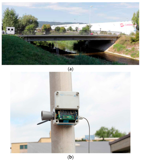 Sensor node with sonar mounted on a light pole [3]. (a) The monitored road bridge (b) Sensor node with sonar mounted on a light pole.