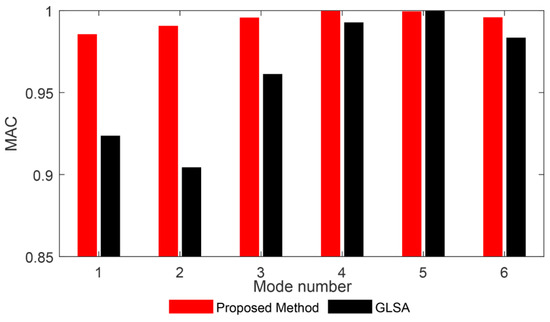 In practical structural health monitoring (SHM) systems, there may be challenges in accurately distinguishing identified mode shapes from one another, thereby potentially compromising the precision of vibration analysis [81,82,83,84]. Hence, it is advisable to utilize measures of information effectiveness, such as the modal assurance criterion (MAC) [22,25,27,85,86,87,88,89], modal strain energy (MSE) [21,23,24,90,91], singular value decomposition ratio (SVDR) [26,92,93,94], least square method (LSM) [95,96,97], and Fisher information matrix (FIM) [98,99,100,101,102,103,104], to assess the linear independence of identified mode shapes. The various modal evaluation criterias are detailed in Table 5 and Figure 13, Figure 14, Figure 15, Figure 16 and Figure 17 as shown.