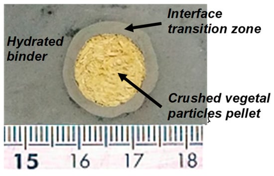 The use of this kind of material is limited due to the great variability of mechanical properties and the formation of a poor interface between vegetal particles and binders. This interface zone is not specific to plant-based concretes; it also exists with regular concrete between the cement paste and aggregates []. However, the zone impacted is slightly smaller. In the case of vegetal concrete, a large area called the interfacial transition zone (ITZ) appears around vegetal particles (Figure 1) [].