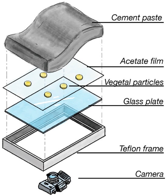 The test of Diquelou [,] is an experimental way to observe and study the appearance and development of the ITZ. The principle is to create a halo in the cement paste around the vegetal particle to obtain a visible and quantifiable transition zone. To do this, a crushed vegetal particle pellet, with controlled dimensions and weight, is produced to avoid discrepancies in using an individual shiv (size, weight, and shape). In addition, crushing the plant particles increases their specific surface area, improving the extraction of free compounds, and it overcomes the differences in particle size between the types of plants studied. The pellet is put in contact with the binder; then, the setting of the paste around it is observed. The following protocol resulted from the original one and from some improvements added to reduce the uncertainties linked to the setting of the experiment. Indeed, it was noticed that the repeatability of the experiment must be improved []. After the validation of the protocol with robust and reliable results, the following hypotheses had to be tested: