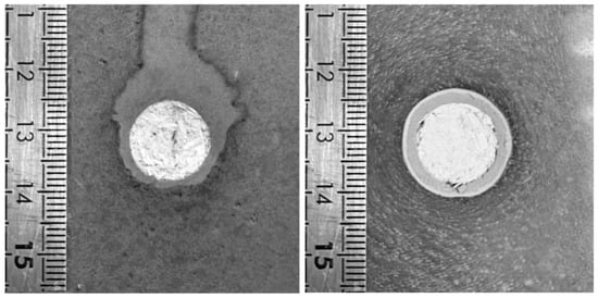 A halo obtained with a pellet on top of the cement paste (left) and on the bottom of the mold (right). The hemp shiv pellet is 13 mm in diameter.