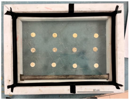 The pellets were glued onto an acetate film using spray glue. First, a template was placed under the film to mark the position of the pellets in order to prevent two pellets from being too close to each other and interacting. On an A4 size film, up to 12 pellets could be glued. The glue was sprayed on one side of the pellet from about 200 mm. After a few minutes, allowing time for the solvent to evaporate according to the glue supplier’s instructions, the pellets were glued onto the film and pressed with a weight of about 800 g for a minute (a bowl filled with 800 mL of water could be used). A prepared film can be seen in Figure 4.