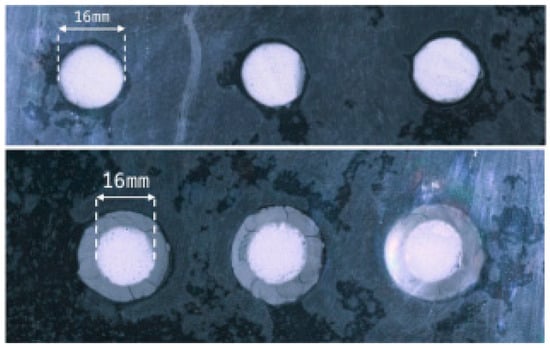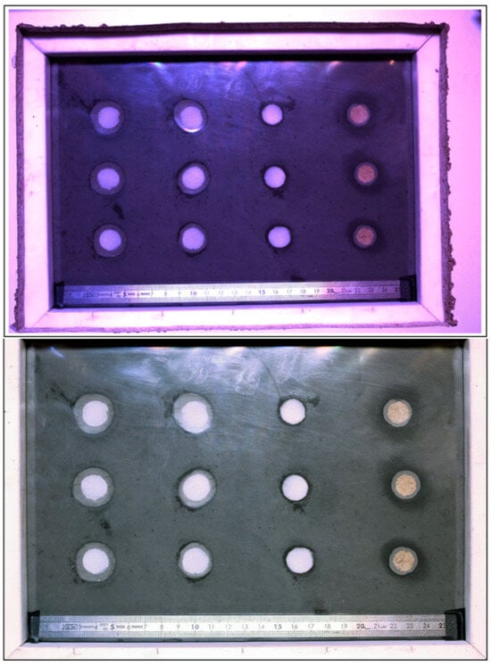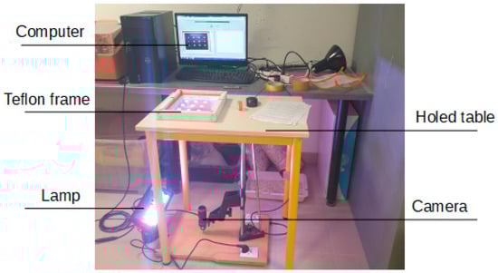 The acetate film, with the pellets stuck onto it, was fixed to the Teflon mold with adhesive tape to prevent cement paste from running under it. The mold was placed on a holed table so that its bottom was visible from below (Figure 5). The horizontality of the experiment table had to be checked to avoid runoffs. The entire mold was visible to the camera (mvBlueFOX3-2 2071a with a Sony IMX428 sensor and a 3216 × 2208 resolution, a 28 mm lens, and a max aperture of f:1.8). The camera’s settings had to ensure a clear image for each pellet without a reflection. Then, the cement paste was poured and leveled by slowly agitating the mold to eliminate air bubbles.