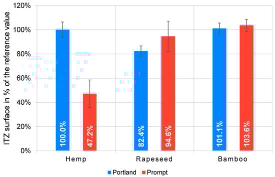 Comparison of mean halo surface between Portland and Prompt binders. Hemp in Portland cement as reference.