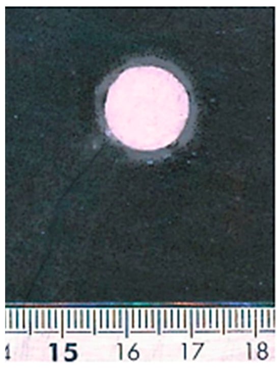 The images were captured using a custom LabView program 20.0 []. They were corrected and adjusted using Adobe Lightroom 7.0 []. The processed images were compiled into a timelapse using MatLab software R2021a []. To utilize the result, the area of the halo had to be measured. ImageJ software 1.51 [] was used to measure the surface of the halo by drawing an ellipse in the software. An example of a processed image is presented in Figure 6.