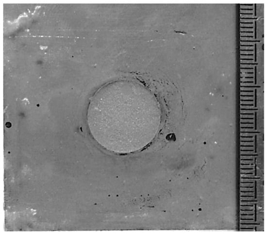 To determine the origin of the ITZ formation, the same tests were carried out with plastic and foam pellets. The halos formed are presented in Figure 9 and Figure 10, respectively. These results showed that the influence of absorption was negligible, as no halo was formed with a plastic (Figure 9) or with a foam, which can absorb up to two hundred times its own mass, in water (Figure 10). Consequently, the cause of the halo seems to have been the release of molecules via the vegetal particles. Sugars are known to be retarding agents for the setting of cement paste. By studying the halo formed via foam pellets soaked in different concentrations of sugar (Figure 11), it becomes clear that the size of the halo is linked to the amount of sugar: the more sugar, the bigger the halo. This influence is clearly visible in Figure 11, even with very low sucrose concentrations. The halo reached a maximum size when the sucrose concentration exceeded a threshold value, which was between 10 and 20 g/L (with sucrose soaked into a foam pellet of 16 mm in diameter and approximately 1 mm in thickness). Moreover, tests with different sugars found in the vegetal particles, like xylose, and with various foam porosities had to be investigated. To reduce the size of the halo, one would have to find a way to either reduce the amount of sugar in the fibers or stop the phenomenon of the release of sugars into the cement paste.