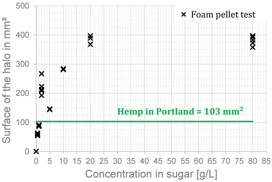 Size of the halo with respect to the sucrose concentration. Foam pellet of 16 mm in diameter in Portland cement. Green line for reference: hemp shiv in Portland.