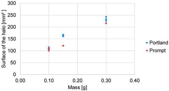 To be able to compare vegetal particles with different bulk densities to each other, the following question should be answered: Should one think in terms of mass or volume to produce pellets? Rapeseed and hemp have similar volumes because of their very close bulk densities. However, bamboo is almost three times denser than hemp, and its pellets have a smaller volume (the same diameter but a lower thickness). Bamboo pellets with a different mass, e.g., with a different thickness, were tested. In the case of bamboo particles, the size of the halo depended on the number of fibers contained in a pellet (Figure 12). It is clear that the mass of the pellet has an influence on the obtained halo, no matter what binder is used. This interdependence can be explained by the fact that an increased mass involves a higher quantity of molecules likely to be extracted. It could also be explained by the fact that the contact zone between the vegetal particles and the binder is increased, which could also increase the release of extractable molecules into the binder. Both Portland and Prompt cements show a bigger halo with a heavier pellet, but the distinction between the two binders is not significant. At a mass of 0.10 g, both areas are very similar. At a mass of 0.15 g, the difference between the two cements is more pronounced. In the conditions for the test that were used, the Prompt cement provided better results with a halo 35% smaller than Portland (areas of 121.2 mm2 in Prompt and 164.5 mm2 in Portland). At a mass of 0.30 g, the difference was only 7% (Figure 12). Future experiments have to focus on the surface of interaction between the vegetal particles and the binder when using different sizes of pellets. The study of the halo volume, rather than its area, also has to be investigated.