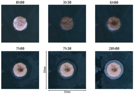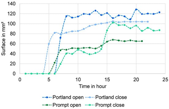 The appearance of the halo created due to the hemp shiv in Portland cement, in Prompt cement, and with open or closed drying surfaces on the top of the mold was studied hour after hour. The goal was to understand how the binder and the curing conditions could impact the kinetics of the reactions (Figure 13). The kinetics were very different according to the binder and the curing conditions (Figure 14). When the halo started to be visible, it almost already achieved its final area (except for Prompt cement with a closed hydration surface, which presented a stage around 8 h before increasing again at 14 h). This means that the diffusion phenomenon had already occurred and was over.