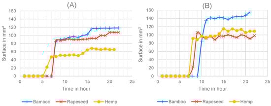 Bamboo, rapeseed, and hemp in Portland cement with (A) an open drying surface and (B) a closed drying surface.