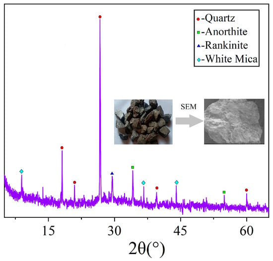 The IOTA from an iron ore tailings reservoir in Shangluo was collected as coarse aggregate to produce concrete. The apparent density, water absorption, bulk density, mud content, and crushing index of the crushed stone were 2610 kg/m3, 1.66%, 1352.5 kg/m3, 3.1%, and 12.4%, respectively. The chemical compositions of the coarse aggregates, including NA and IOTA, are listed in Table 1. Figure 1 presents the phase composition of IOTA. It is worth noting that the crystalline composition of the IOTA is still dominated by quartz compared to others and that its surface is relatively angular. The grading curves of the aggregate are shown in Figure 2.