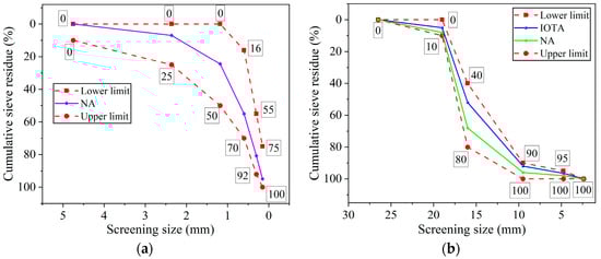 Grading curves of the aggregates. (a) RS. (b) NA and IOTA.