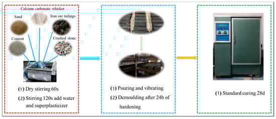 The mix proportions of the three series (NAC, TAC, and TAC-CW) are listed in Table 3. NAC (the control group) contained 100% NA. To maximize the reuse of industrial byproducts, the replacement ratio of IOTA in TAC was set at 100%. TAC-CW was prepared with 10%, 20%, and 30% CWs []. Cubic specimens (100 mm × 100 mm × 100 mm) and prismatic specimens (100 mm × 100 mm × 400 mm) were produced. The preparation process of the concrete specimens, including primary mixing, pouring, and curing, is shown in Figure 3.