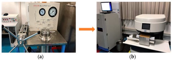 As a non-destructive testing technique, NMR has been widely used to analyze the pore structure of porous materials (without magnetically conductive components). The 100 mm concrete specimens underwent NMR analysis using a MacroMR12-150H-I NMR system with a magnetic field strength of 0.5 T and a frequency range of 50–60 Hz. The specimens were positioned within a pressurized saturation device, facilitating complete water penetration before testing to ensure thorough saturation, as shown in Figure 4.