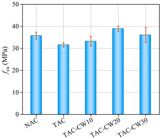 The changes in fcu at 28 days of concrete with different CW contents are provided in Figure 5. It can be observed from the histogram that the fcu of TAC was reduced by 11.68% as compared to NAC. This may be attributed to the high crushing index and water absorption of IOTA, as the level of water absorption reflects to some extent the number of pores within the IOTA. The compressive strength of the concrete exhibited varying degrees of enhancement with 10%, 20%, and 30% CWs, and the trend in strength improvement initially increased with the growing amount of CWs but eventually displayed a rising followed by a decreasing pattern. Specifically, the compressive strengths of TAC-CW10, TAC-CW20, and TAC-CW30 increased by 5.22%, 23.26%, and 14.3%, respectively, compared to TAC. The compressive strength of TAC-CW20, with the best CW level of 3%, exceeded that of NAC by 8.86%. This enhancement is mainly attributed to CWs having good compatibility with cementitious materials and, at the micron scale, being able to play the role of microfine powder to optimize and fill the large-size pores generated within the matrix of iron tailings concrete during the casting process and hydration process. At the same time, CWs dispersed within the matrix can inhibit microcracking, convergence, and expansion []. Unfortunately, when the dosage of CWs is high, they will agglomerate inside the matrix, which will lead to the deterioration of the internal microstructure of the matrix (poorly bonded interfaces as well as an increase in porosity), and the corresponding enhancement effect will be reduced [,].