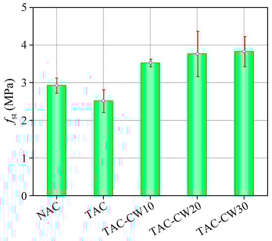 The test results provided in Figure 6 present the fst results for concrete at 28 days. Figure 6 reveals that the fst of TAC, which includes 100% IOTA, undergoes a 14% decrease compared to NAC. This suggests that the substitution of NA with IOTA results in a deterioration in the fst of the concrete. When CWs are added to TAC, a significant increase in fst results. For example, incorporating 10%, 20%, and 30% CWs led to respective increases of 40.07%, 49.6%, and 51.98% in the fst values of TAC-CW10, TAC-CW20, and TAC-CW30 compared to TAC. Furthermore, the fst values of all three variants exceeded that of NAC. The primary factor contributing to concrete’s heightened splitting tensile capacity lies in the disorderly distribution of CWs adhered to the matrix, which could occur through the formation of tensile knots, bridging links, and fracture of CWs [].