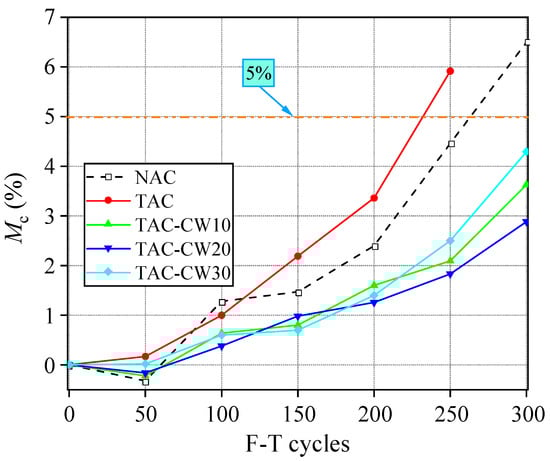 Concrete mass deterioration under the influence of F-T cycles, a primary evaluation criterion, is attributed to the detachment of surface mortar and aggregates. The changes in specimen mass loss (Mc) under different sulfate F-T cycles are demonstrated in Figure 7. It can be generally observed from Figure 7 that the Mc values of individual specimens gradually increase in the early stages with the increase in F-T cycles. However, it should be noted that NAC, TAC-CW10, and TAC-CW20 show increases in Mc after 50 F-T cycles. The TAC specimens experienced notable Mc beyond 100 F-T cycles, which reached the 5% damage criterion after 200 F-T cycles. However, the Mc rate of concrete was considerably mitigated by adding 10%, 20%, and 30% CWs. The Mc values of TAC-CW10, TAC-CW20, and TAC-CW30 decreased rapidly after 250 F-T cycles. When subjected to 300 F-T cycles, the Mc values of TAC-CW10, TAC-CW20, and TAC-CW30 were less than 5% of the damage criterion, and the Mc values of the three were reduced by 44.14%, 55.61%, and 33.92%, respectively, compared to NAC.