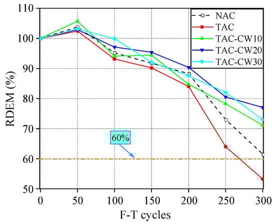 The test results for RDEM for the calcium carbonate whisker-reinforced iron ore tailings concrete specimens subjected to F-T cycles are presented in Figure 8. It is evident that each specimen follows a similar degradation pattern during the sulfate F-T cycle. Initially, there is an increase in RDEM with F-T cycles, followed by a subsequent decline, particularly after 200 F-T cycles. This indicates sulfate infiltration and crystallization within the matrix, leading to an initial RDEM increase and later decline due to increased pore damage and F-T erosion. For example, after 50 F-T cycles, the RDEM increased by 3.77%, 2.44%, 5.72%, 2.87%, and 3.14% for NAC, TAC, TAC-CW10, TAC-CW20, and TAC-CW30, respectively. However, from 50 to 200 F-T cycles, RDEM decreased by 11.73%, 15.94%, 15.24%, 9.63%, and 12.41%, respectively, without reaching the failure threshold of 60%. By 300 F-T cycles, TAC had failed, whereas NAC exhibited a 38.45% decrease in RDEM but did not fail. Conversely, RDEM for TAC-CW10, TAC-CW20, and TAC-CW30 remained above 70% by 300 F-T cycles, increasing by 15.54%, 25.18%, and 18.63%, respectively, compared to NAC. These results highlight the improved frost resistance of TAC-CW20 due to the appropriate addition of CWs.