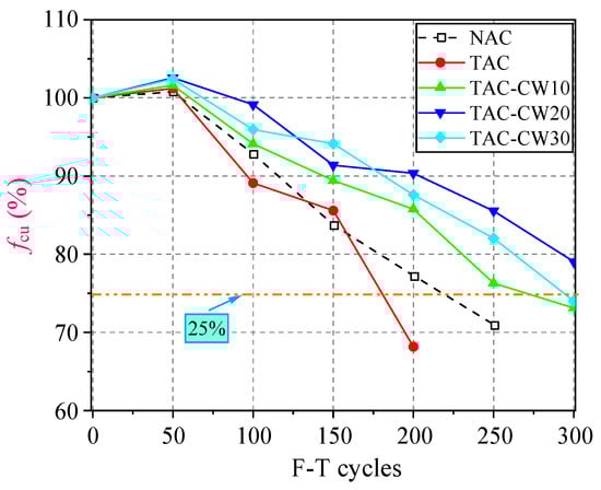- The F-T damage of concrete initially increases and subsequently decreases during F-T cycles in Na2SO4 solution. When the CWs were added to TAC, TAC-CW20 showed the best frost resistance compared to the other groups of specimens undergoing 300 F-T cycles.