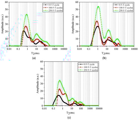 Test results represented by T2 spectral fluid distribution curves after different F-T cycles. (a) NAC. (b) TAC. (c) TAC-CW20.