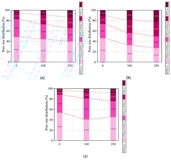 Based on the NMR T2 spectral distribution results and insights from the literature [], concrete pores were categorized into four categories according to their radius (r), including harmless pores (r < 0.02 μm), less harmful pores (0.02 μm ≤ r < 0.05 μm), harmful pores (0.05 μm ≤ r < 0.20 μm), and more harmful pores (r ≥ 0.20 μm). Figure 11 presents the pore size distribution of specimens subjected to various F-T cycles. Figure 12 illustrates the evolution of harmless and less harmful pores into harmful and more harmful pores due to the F-T cycles. For example, before the F-T cycles, the percentages of harmless pores for NAC, TAC, and TAC-CW20 specimens were 48.5%, 44.4%, and 40.1%, respectively. However, after 250 F-T cycles, the percentages of more harmful pores increased to 13.6%, 22.5%, and 8.2% for NAC, TAC, and TAC-CW20, respectively. The ingress of SO42− into concrete, primarily facilitated by the F-T process, leads to their interaction with hydration products and the generation of erosion products such as gypsum and AFt. As the number of freeze–thaw cycles increases, the reaction between SO42− and hydration products intensifies, resulting in excess production of gypsum and AFt. The pore walls cannot withstand the expansion pressure from these products, leading to damage. Consequently, initially, harmless pores transform into more harmful ones, exacerbating the overall concrete deterioration. Furthermore, it is evident that compared to NAC, the addition of IOTA negatively impacts the pore size distribution of TAC. Conversely, TAC-CW20, incorporating CWs, exhibits superior pore characteristics compared to NAC. This improvement is primarily attributed to the hydrophilic nature of CWs, enabling the concrete to absorb unfrozen pore solution and free water, thereby reducing the hydrostatic pressure within it. Simultaneously, the “CW network” effectively separates and refines distributed air bubbles, restraining the further development of cracks during F-T cycles due to the bridging effect of CWs.