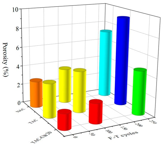 Figure 12 illustrates the porosities of specimens after different F-T cycles. It is evident that the porosity gradually increases with the number of F-T cycles. Compared to the 0 F-T cycle condition, the porosity of specimens of NAC, TAC, and TAC-CW20 increased by 31.65%, 22.03%, and 26.82% after 100 F-T cycles, respectively, and increased by 161.15%, 162.71%, and 181.09% after 250 F-T cycles, respectively. In addition, compared to NAC, after 250 freeze–thaw cycles, TAC exhibited a 28.1% increase in porosity, whereas TAC-CW20 showed a notable 36.5% decrease. This reinforces the favorable mechanical properties and freeze–thaw resistance of TAC-CW20 from the mesoscopic porosity point of view.