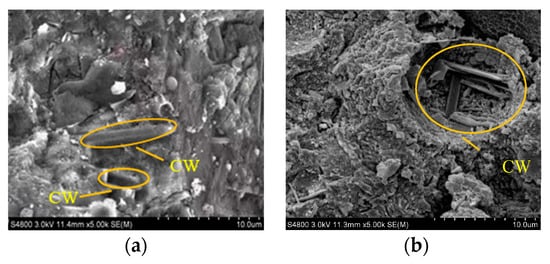 Calcium carbonate whiskers (CWs) offer a renewable and environmentally friendly solution for enhancing concrete performance [,]. Compared to alternative fibers and whiskers, CWs offer a cost-efficient manufacturing approach and uncomplicated production processes. Additionally, CWs have the potential to replace expensive commercial fibers, including carbon fiber (CF), polypropylene (PP) fiber, and polyvinyl alcohol (PVA) fiber []. Research conducted by Cao et al. [,] revealed that incorporating just 10% of calcium carbonate whiskers into cement-based composites effectively inhibited the formation of microcracks at a microscopic level, leading to improvements in the microstructure and overall physical properties of the composites. Similarly, Saulat et al. [] found that adding calcium carbonate whiskers primarily bolstered compressive, flexural, splitting tensile, and impact strengths; toughness; and compactness in cement-based materials. Furthermore, Guo et al. [] analyzed the impact of calcium carbonate whiskers on concrete properties alongside basalt fibers and mesh polypropylene fibers, highlighting their role in optimizing concrete porosity and enhancing its strength, toughness, and impact resistance.
