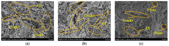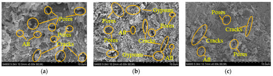 Figure 13 shows the dispersion of CWs inside the matrix, and it can be found that the CWs inside the TAC-CW20 specimen are relatively well dispersed, while the CWs inside the TAC-CW30 specimen appear to be agglomerated. Figure 14 and Figure 15 depict the internal microstructures of the specimens following 100 and 250 F-T cycles. It can be seen in Figure 14a–c and Figure 15a–c that after 100 F-T cycles, the emergence of erosion produces rod-like crystals (gypsum), needle-like crystals (caliche), and fine-grained crystals in the NAC, TAC, and TAC-CW20 specimens. Additionally, distinct microcracks and micropores are visible within individual specimens, although they are not interconnected. Following 250 F-T cycles, a significant increase in erosion products is observed in all specimens, accompanied by a notable expansion in the scale of microcracks due to repeated F-T cycles and crystallization expansion stress. Furthermore, micropores develop into microcracks through connectivity. These findings elucidate the deterioration mechanism of macroscopic properties (mass, compressive strength, and relative dynamic modulus) of concrete specimens under sulfate F-T cycles. Notably, after 250 F-T cycles, the interior of TAC exhibits a looser structure than NAC. At the same time, TAC-CW20 shows a relatively denser interior with fewer erosion products, further validating the superior frost resistance of TAC-CW20.