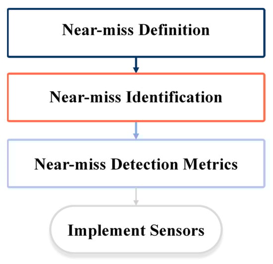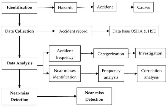 The research methodology included four major stages, including identification (i.e., hazards, accidents, and causes), data collection (accident and hazard records from the OSHA and HSE), data analysis (frequency analysis and correlation), and near-miss detection (establishing a near-miss metric). In the identification process, first, the authors identified significant hazards and accidents associated with these hazards. Then, they investigated the summary of the accidents to identify the underlying causes and performed a correlation analysis to find the significant causes responsible for these accidents. The authors subsequently created a well-designed near-miss data repository in terms of underlying causes identified from the summary of historical accidents. Lastly, they developed near-miss detection metrics consisting of quantifiable data required to autonomously detect near-misses. The detection metrics offered a strategic approach for selecting and deploying relevant sensors to collect and evaluate near-miss data. In the end, the key findings of this study are presented in the Discussion, and a conclusion is derived. The data required for near-miss identification were acquired based on the specified definition, and the near-miss detection metrics were established.