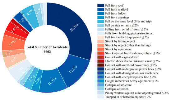 The final data set comprised 6663 accidents, among which 4532 were fatal and 2131 were non-fatal. The accidents included 4489 (67.4%) fall-related accidents, 933 (14.1%) struck-by-related accidents, 574 (8.61%) electrocution-related accidents, and 667 (10.2%) caught-in- or -between-related accidents. Figure 3 summarizes the statistical results of the OSHA accident records []. According to the occupational codes provided by the OSHA, the victims involved in these accidents were masons, carpenters, electricians, painters, plasterers, plumbers, roofers, duct installers, welders, cutters, and machines operators, and other workers.