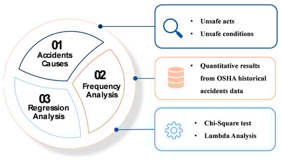 Sensor-based safety management systems can be established more efficiently if each accident precursor is well investigated and quantitative metrics are defined []. Therefore, a quantifiable definition of near-miss is required to select and employ sensing technologies for autonomous near-miss data collection. Understanding the causation of accidents may facilitate quantifying near-miss definitions, as near-misses and accidents have the same causation model [,,,]. Near-misses share common causes with accidents, but unlike the latter, the effects of a near-miss are negligible because the opportunity factor is absent (Equation (1)) []. Ritwik [] defined an opportunity factor as an uncertainty factor beyond control that decides the event’s consequences. Based on the above recognition, analyzing the underlying causes of accidents can assist in identifying their previous near-misses, reducing the uncertainty regarding the possibility of an accident.