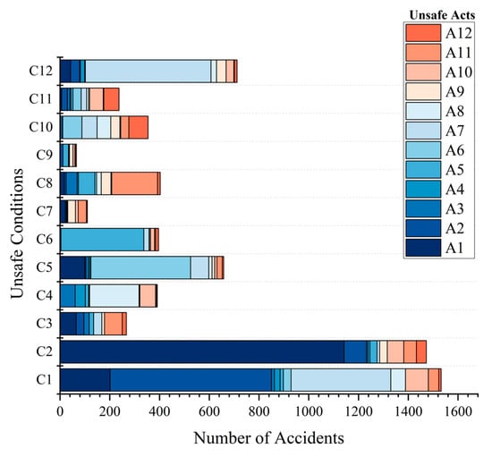 Because most accidents occur when an unsafe act and condition are combined, the authors performed a frequency analysis to identify the number of unsafe acts and conditions responsible for construction accidents among the unsafe acts and conditions previously identified. The 5725 construction accident cases were analyzed. Figure 5 shows the frequency of accidents caused by a particular combination.