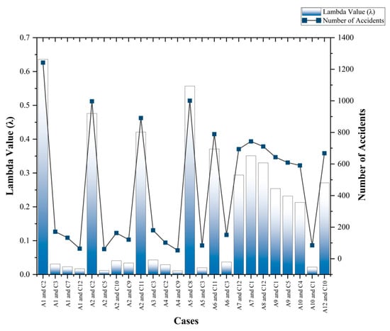The SPSS 29 (IBM, Armonk, NY, USA) analysis software was used to perform this statistical analysis. No cell had an expected frequency of zero, and only 20% of the cells had an expected frequency of less than five. As a result, the data were eligible for the chi-square test. The chi-square test was performed at a significance level (p-value) of 0.01 (1%). The null hypothesis that “there is no association between the unsafe act (A) and unsafe condition (C) under test” was rejected when the estimated p-value was less than the accepted significance level, implying a strong correlation between the two variables. Only combinations that passed the chi-square test were considered for the lambda test. Figure 6 summarizes the results of the correlation analysis.